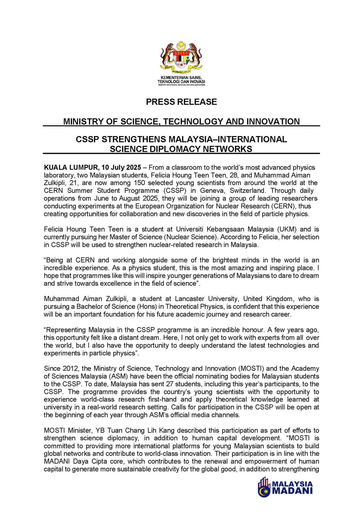 August 29, 2025Congratulations to two outstanding Malaysian students, Felicia Houng Teen Teen and Muhammad Aiman Zulkipli, who have been selected to participate in the prestigious CERN Summer Student Programme (CSSP) in Geneva, Switzerland, from June to August 2025!